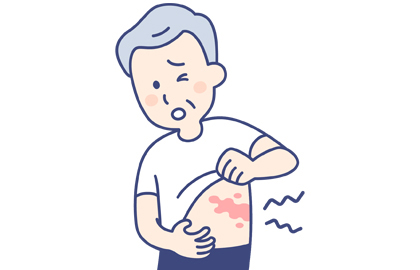 帯状疱疹は、過去に水痘(水ぼうそう)にかかった時に体の中に潜伏した水痘帯状疱疹ウイルスが再活性化することによっておこるものです。神経に沿って発疹がでて、典型的には体の左右どちらかに帯状に、時に痛みを伴う水疱(水ぶくれ)が出現する病気です。