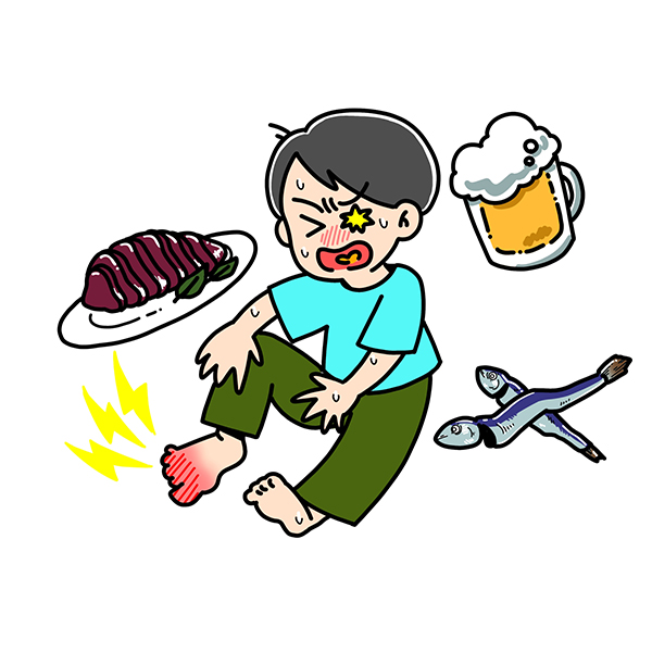 痛風は、血液中の尿酸が増えて結晶になり、関節炎などを引き起こす病気です。痛風になる前段階で血液中の尿酸値が高い状態が続くことを高尿酸血症といいます。これを放置すると、典型的な症状として、「足が痛い」「足が腫れる」というものがあらわれます。お酒を飲む人や暴飲暴食する人に多いのが特徴の病気です。治療には、お薬、食事療法、運動療法を行います。