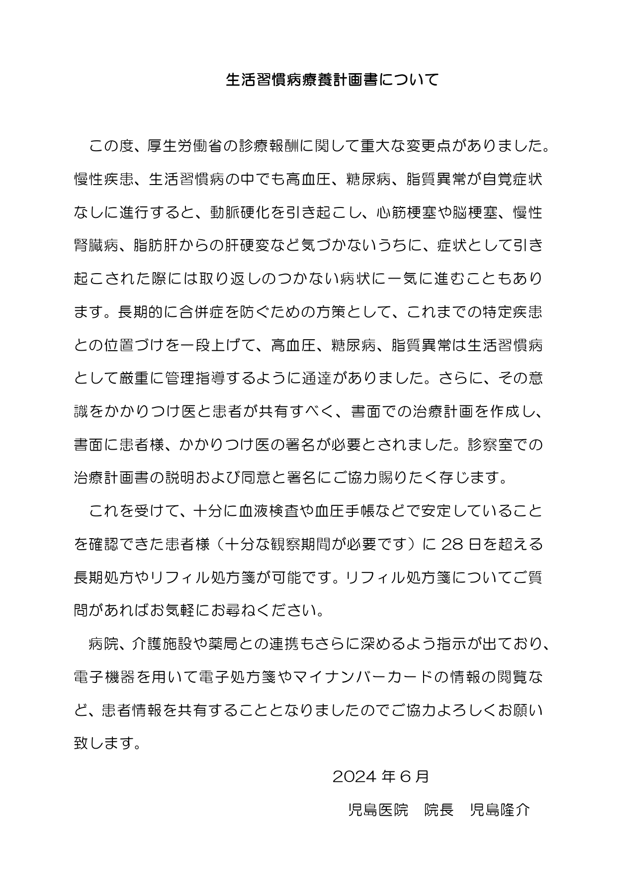 高血圧症・糖尿病・高脂血症を主病とする患者さんには6月から生活習慣病管理料(Ⅱ)が算定されることになり、保険点数がかわりますのでお知らせいたします。